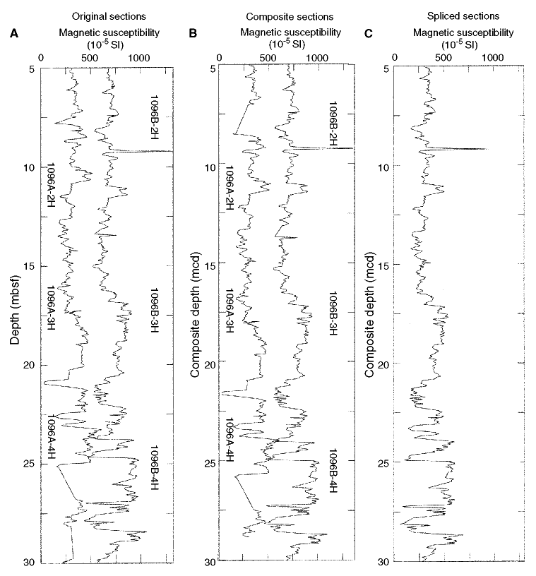 Figure F14. Example of the magnetic susceptibility records (5-30 mbsl) from Site 1096. A. Cores plotted on the mbsf depth scale. Data from Hole 1096B have a horizontal offset by a constant factor. B. The same cores on the mcd scale. The composite depth section has the advantage that features common to all holes are in relative alignment. C. Provisional spliced section of Holes 1096A and 1096B.