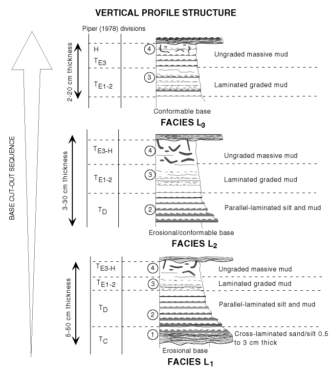 Figure F3. Schematic representation of internal structure of facies within turbidites recovered during Leg 178 compared with Piper's (1978) descriptive scheme for muddy turbidites. The three facies recognized are essentially formed by repetitive turbidite sequences that form relatively thick depositional units. Intensity of bioturbation, amount of ice-rafted debris, and thickness of hemipelagic division at bed tops depends on the recurrence interval of turbidity currents.