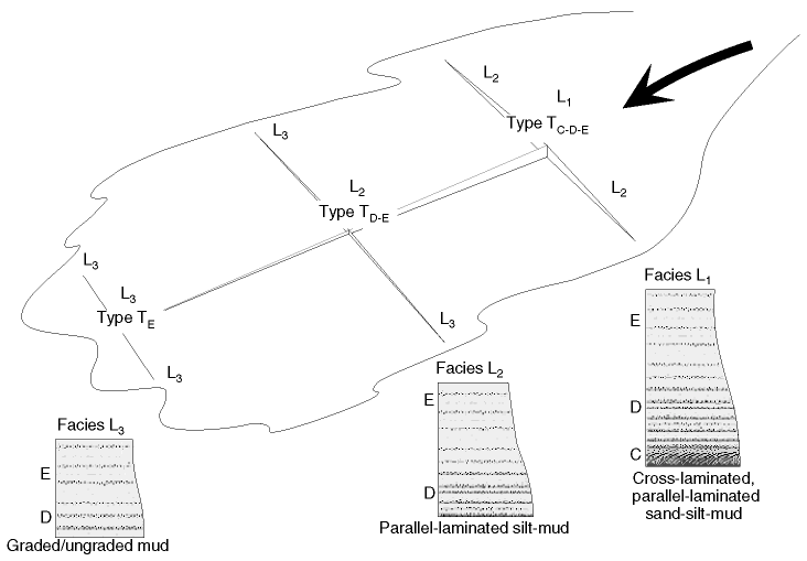 Figure F4. Schematic diagram showing typical downslope and across-slope relationship between turbidite Facies L1, L2, and L3 as proposed by Stow and Piper (1984).
