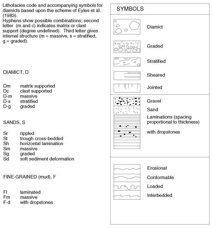 Figure F6. Schematic representation of diamict and other facies and physical structures identified during Leg 178.