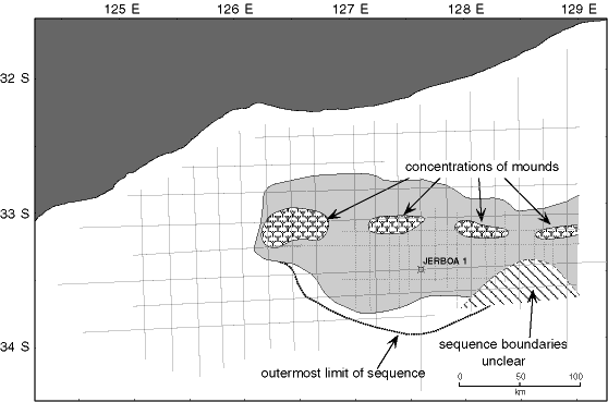 Figure 16—Map showing distribution of the early Pliocene sequence 3 aggradational shelf unit. Note the concentrations of biogenic mounds along the innermost part of this sequence.