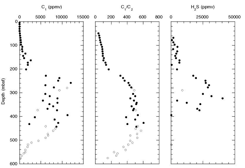 Figure F13. Methane (C1) concentration, methane/ethane (C1/C2) values, and hydrogen sulfide (H2S) concentration of headspace gases from Holes 1129C and 1129D. Solid circles = Hole 1129C; open circles = Hole 1129D; ppmv = parts per million by volume.