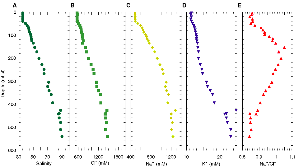 Figure F16. Summary trends at Site 1129 in (A) salinity, (B) Cl-, (C) Na+, (D) K+, and (E) Na+/Cl-. Although the ion concentration trends show a diffusive profile, the Na+/Cl- ratio shows a maximum between 90 and 120 mbsf. Note the absence of gradients in the upper 40.3 mbsf, which indicates the advection of fluids through the sediments.