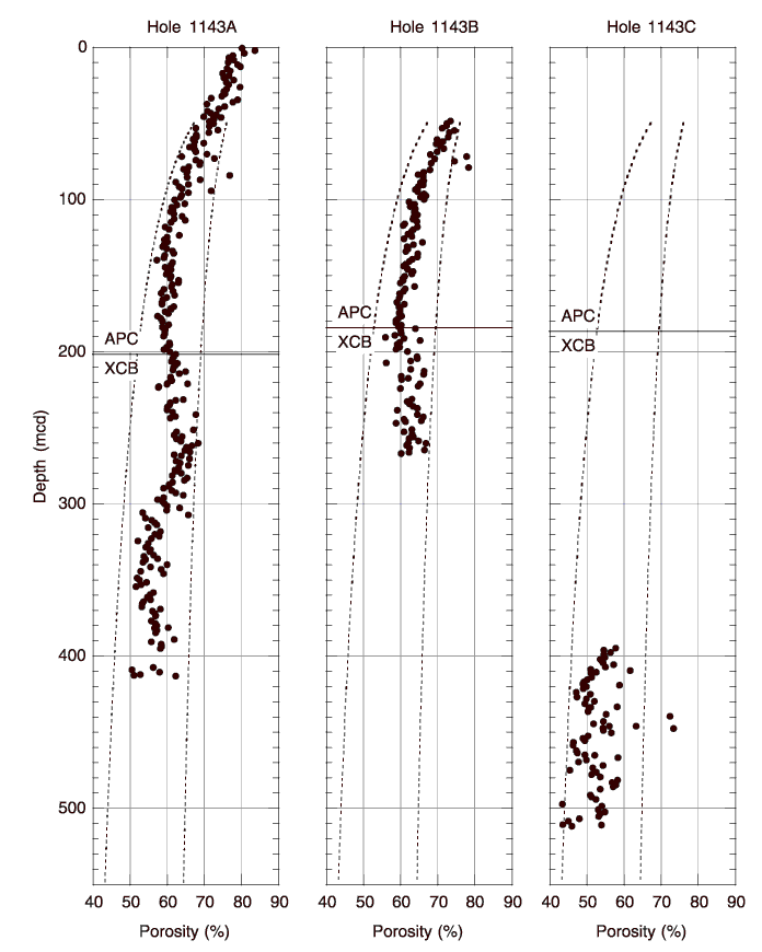 Figure F24. Porosity values (solid circles) obtained from the MAD method. Dashed lines are power curve fits to extreme values at given depth intervals and represent envelope trends. APC = advanced hydraulic piston corer, XCB = extended core barrel.