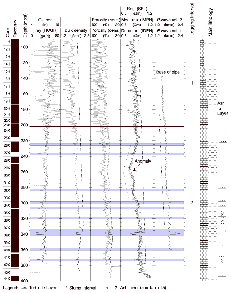 Figure F34. Downhole logs of hole diameter, computed gamma ray (HCGR), bulk density, neutron porosity (neut.), density-derived porosity (dens.), electrical resistivity (spherically focused log [SFL], medium induction phasor-processed resistivity [IMPH], deep induction phasor-processed resistivity [IDPH]), and P-wave velocities from Hole 1143A. Comparison of logging data and core-derived lithostratigraphy (see "Lithostratigraphy") in Hole 1143A is also shown. Shaded intervals mark distinct features in the logs that correspond to turbidites/slumps. The integrated interpretation of FMS images and standard logs enables identification of the displayed interval boundaries. Dashed lines = general trends of some particular curves.