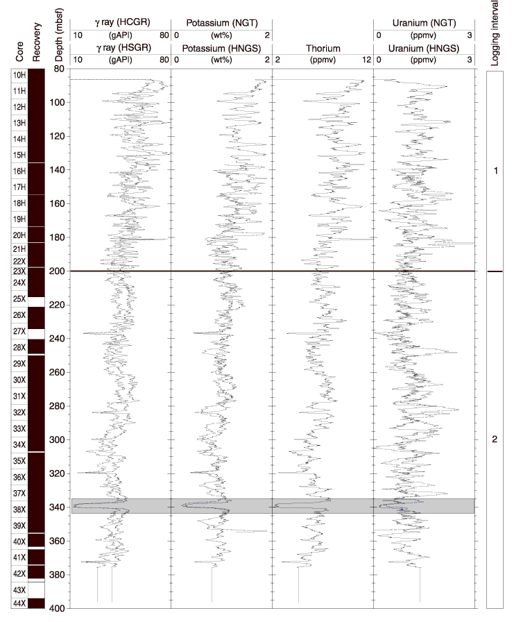 Figure F35. Downhole logs from the hostile environment natural gamma-ray sonde (HNGS) tool on the triple combo tool suite. HCGR = computed gamma ray, HSGR = standard gamma ray, NGT = natural gamma-ray tool. Shaded interval marks distinct drop in all records corresponding to a turbidite (see Fig. F40 and "Lithostratigraphy").