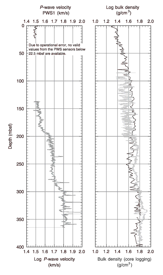 Figure F36. Comparison of P-wave velocities from downhole logs with physical properties measurements from core logging (see "Physical Properties") and of densities determined from downhole logs and MST gamma-ray attenuation bulk density measurements.