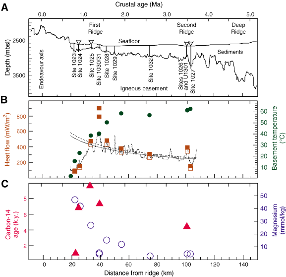 Figure F2. Summary of selected results from Leg 168 and related experiments. A. Interpreted composite cross section from the active spreading center to the west, across the Leg 168 drilling transect, and continuing to the east (Davis, Fisher, Firth, et al., 1997). Vertical lines show locations of Leg 168 boreholes. Triangles at seafloor show locations of reentry cones and CORK observatories installed during Leg 168. CORK systems in Holes 1026B and 1027C were replaced during Expedition 301, and new CORKs were emplaced in Holes U1301A and U1301B, along the same buried basement ridge as Site 1026. B. Summary of thermal data. Solid circles are upper basement temperatures, based on in situ measurements and (in some cases) short extrapolations to basement depths. Open squares are heat flow values determined with Leg 168 temperature and thermal conductivity data, after applying temperature corrections and accounting for thermal conductivity anisotropy (Pribnow et al., 2000). Solid squares show the same values after correction for the effects of rapid sedimentation (Davis et al., 1999). Data from Sites 1030 and 1031 were not sediment-corrected because sediment cover is very thin and because the calculated correction is based on a one-dimensional approximation that is not valid where there are large variations in basement relief below thin sediments. The thin jagged line shows estimated heat flow values across the Leg 168 transect based on seismic and drilling data (Davis et al., 1999), after applying a sedimentation correction. The smooth dotted and dashed curves show lithospheric reference models by Parsons and Sclater (1977) and Stein and Stein (1994), respectively. C. Chemistry of basement fluids, as determined from extrapolation of basal pore fluid gradients to the basement depths and (in the case of Hole 1026B) from direct sampling of formation fluids. Magnesium data show fluid alteration largely as a function of reaction temperature (Davis, Fisher, Firth, et al., 1997; Wheat and Mottl, 1994). 14C data show a consistent progression in apparent age from west to east at the western end of the transect, but samples from Sites 1031 and 1026 are considerably younger than waters to the west (Elderfield et al., 1999).
