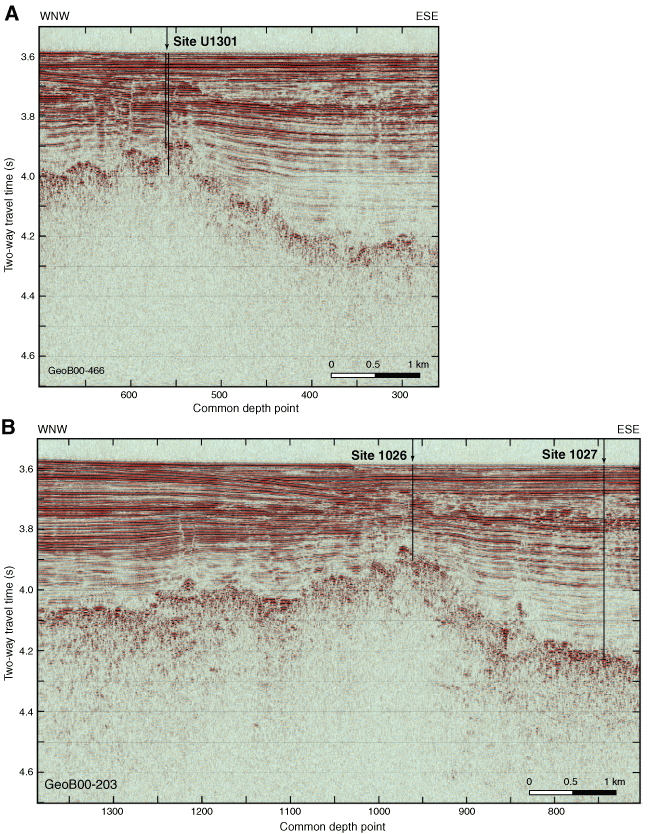 Figure F4. Examples of MCS seismic data from the 2000 ImageFlux survey (Sonne, SO149) showing locations of primary Expedition 301 sites. A. Line GeoB00-446 across the southern part of Site U1301. Vertical lines indicate approximate total depth of Holes U1301A (shallower) and U1301B (deeper). B. Line GeoB00-203 across Sites 1026 and 1027. Vertical lines indicate approximate total depth of both holes. Characteristic basement and sedimentary structures are apparent in both lines. These features are described in the text and in Zühlsdorff et al. (this volume), who also discuss data acquisition and processing.