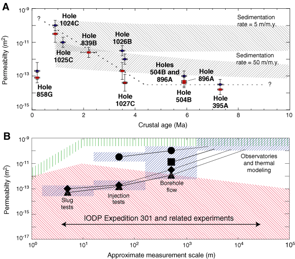 Figure F5. Permeability of upper oceanic crust versus crustal age and measurement scale prior to Expedition 301. A. Permeability versus crustal age. Squares (red) show packer measurements, circles (blue) show results from temperature log (flow meter) experiments. Bars indicate uncertainties in crustal age and estimated bulk permeability. Dashed line shows crude permeability-age trend, with a rapid reduction during the first 4 m.y., followed by a maintenance of bulk permeability of ~10–14 to 10–13 m2 (data compiled from these studies and sources cited therein: Fisher, 1998; Fisher and Becker, 2000; Becker and Davis, 2004). Additional data were collected in 165 Ma seafloor (Larson et al., 1993) but are not shown. Temperature data generally suggest permeabilities somewhat higher than those suggested by packer data. Shaded regions are results of calculations of permeability trends based on consideration of global heat flow data (Fisher and Becker, 2000). Borehole observations are consistent with global heat flow considerations until ~4 Ma, and then observations deviate from these predictions. This may occur because flow becomes more focused with age, as smaller pores fill. B. Permeability estimates from boreholes on the eastern flank of the Juan de Fuca Ridge, plotted as a function of measurement scale (solid symbols and blue shaded areas [Becker and Davis, 2003]). Other shaded areas indicate compilations for fractured crystalline rocks (red bands [Clauser, 1992]) and results from tests in fractured sedimentary rocks (green bands [Rovey and Cherkauer, 1995; Schulze-Makuch and Cherkauer, 1997]). Expedition 301 and related experiments will help to elucidate the scaling of crustal permeability over the range indicated with the double-headed arrow, as discussed in the text and in later figures.