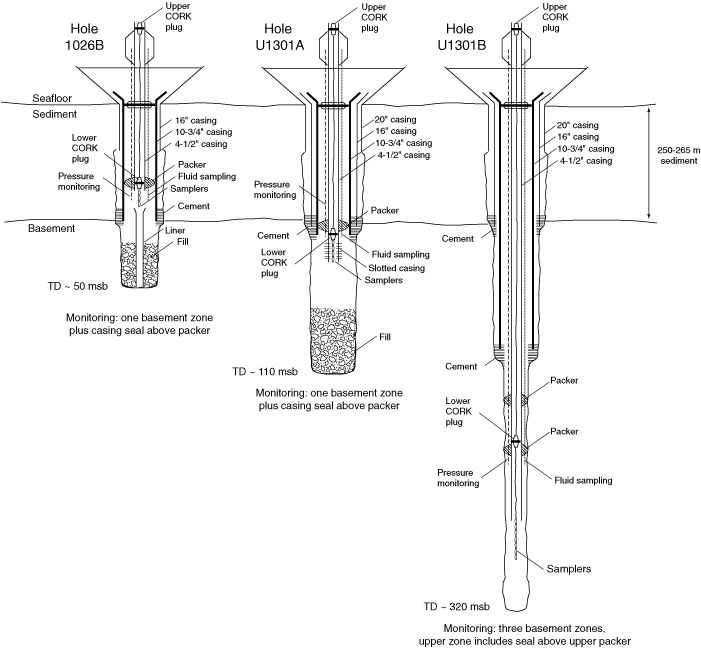 Figure F8. Cartoon illustrating selected features of the three CORK borehole observatory systems installed during Expedition 301. Approximate total depths (TD) listed in meters subbasement (msb) are correct as shown, but drawings are not to scale and do not indicate precise locations of casing, cones, packers, sampling and monitoring lines, or downhole instruments. Hole 1026B was created during Leg 168, whereas Holes U1301A and U1301B were created during Expedition 301. All three CORKs monitor multiple depth intervals. The CORKs in Holes 1026B and U1301A monitor shallowest basement and the zone between the casing packer and the seafloor CORK seal. The CORK in Hole U1301B monitors three basement intervals, with the uppermost interval extending to the seafloor seal. Instruments deployed at depth in all three CORK systems include OsmoSamplers for fluid chemistry, microbiological growth substrate, and autonomous temperature loggers distributed within basement. See Fisher et al. (this volume) and the "Site U1301" and "Site 1026" chapters for additional details regarding CORK configuration and deployment.