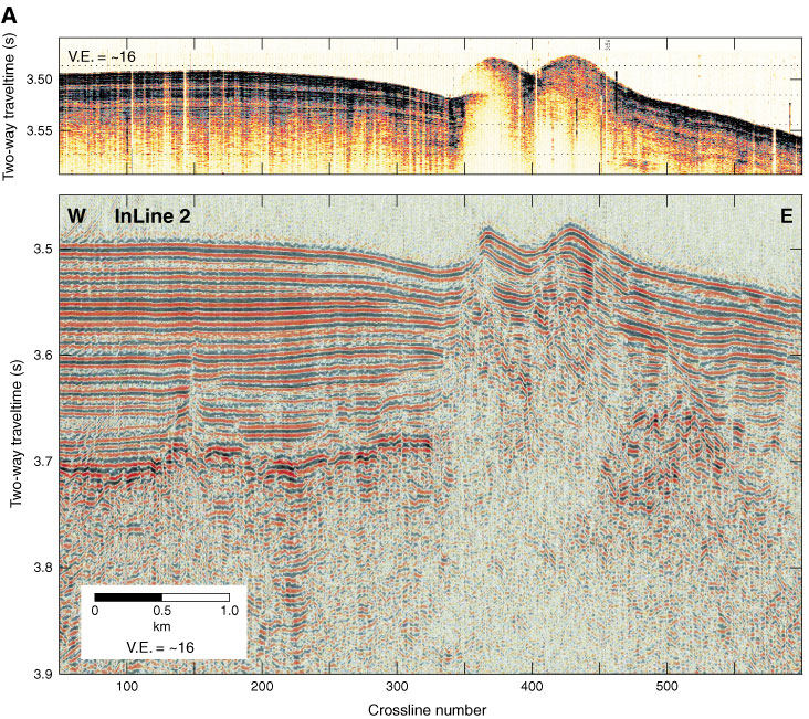 Figure F10. Example seismic lines. MCS and Parasound data, from the 2000 ImageFlux expedition across First Ridge area. Line locations are shown in Figures F4 and F9. VE = vertical exaggeration. A. InLine 2. (Continued on next five pages.)