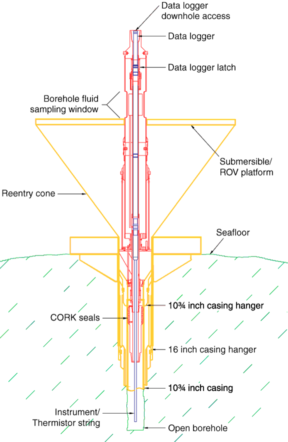 Figure F5. Engineering schematic of the single-seal CORK design (from Graber et al., 2002). Red = CORK body, blue = scientific instrument string. ROV = remotely operated vehicle.