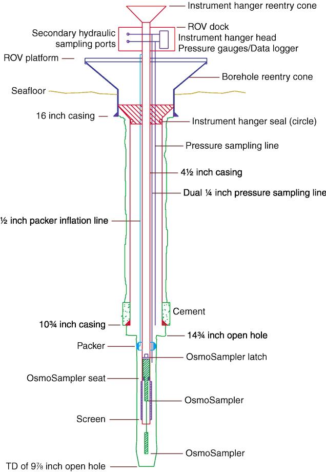 Figure F7. Schematic of the CORK-II as installed at the Costa Rica Margin (from Shipboard Scientific Party, 2003). ROV = remotely operated vehicle. TD = total depth.
