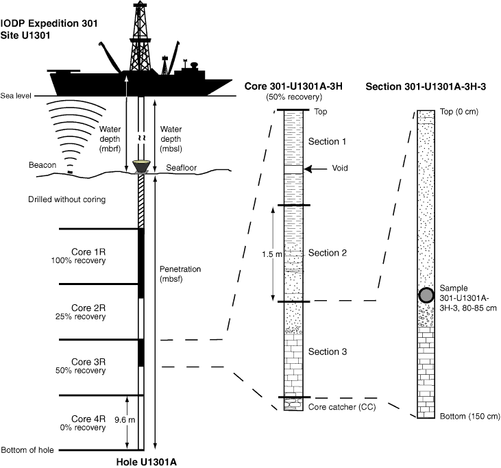 Figure F1. Schematic illustration of core, section, and sample numbering. mbrf = meters below rig floor, mbsl = meters below sea level, mbsf = meters below seafloor.