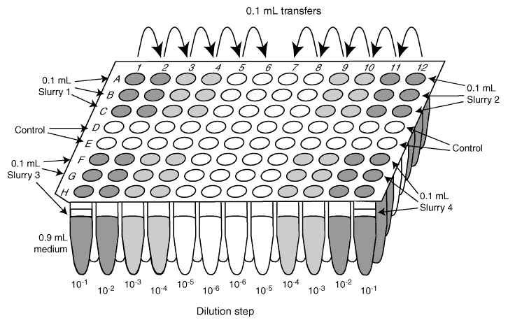 Figure F13. Most probable number counts with a microtiter plate. On a deep-well microtiter plate, four different slurry samples were diluted in triplicate down to 1:106. For each sample, a row remained uninoculated as control. The wells were sealed with a capmat and the plate stored in an anaerobic bag with an oxygen-consuming catalyst and an oxygen indicator.