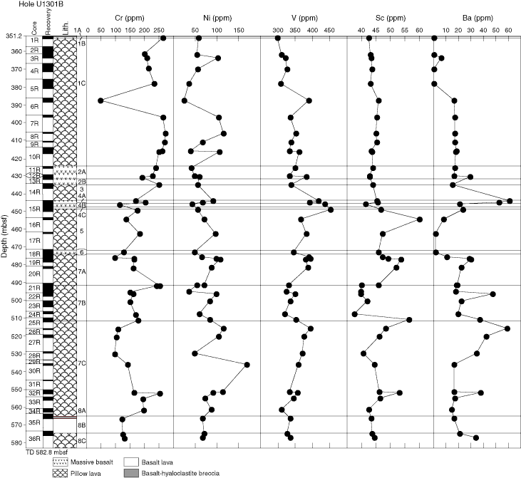 Figure F30. Plots of shipboard ICP-AES analyses versus depth, with igneous stratigraphy and units for comparison.