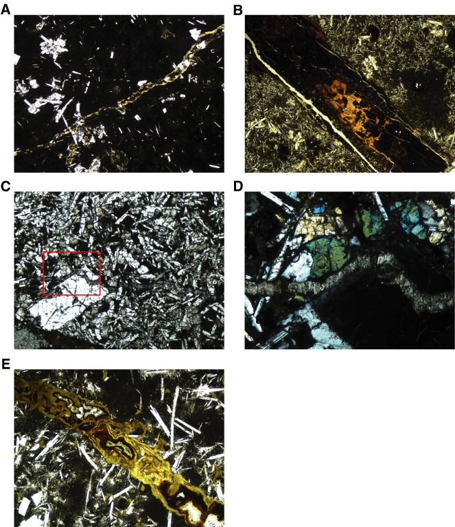 Figure F33. An assortment of veins from Hole U1301B basalts. A. Microvein of saponite (10–20 µm wide), with saponite filling the adjacent vesicles and replacing olivine phenocryst (Sample 301-U1301B-36R-1 [Piece 4, 29–32 cm]); plane-polarized light (field of view [FOV] = 5.5 mm). B. Iron oxyhydroxide and saponite vein, 1.5 mm wide (Sample 301-U1301B-1R-1 [Piece 15, 118–121 cm]); plane-polarized light (FOV = 5.5 mm). C, D. Micrometer-wide calcium carbonate vein, with saponite lined walls, cutting through plagioclase phenocrysts and the intergranular ground mass (Sample 301-U1301B-18R-4 [Piece 1, 17–19 cm]); (C) plane-polarized light (FOV = 5.5 mm), (D) close-up of the fibrous carbonate vein; cross-polarized light (FOV = 1.4 mm). E. Saponite, iron oxyhydroxide, and celadonite vein (1 mm wide) (Sample 301-U1301B-4R-1 [Piece 9, 62–63 cm]); plane-polarized light (FOV = 5.5 mm).