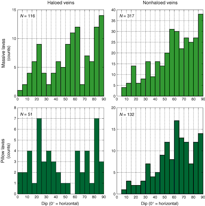 Figure F41. Comparative histograms showing the distribution of dips for haloed and nonhaloed veins and fractures in massive and pillow lava units.