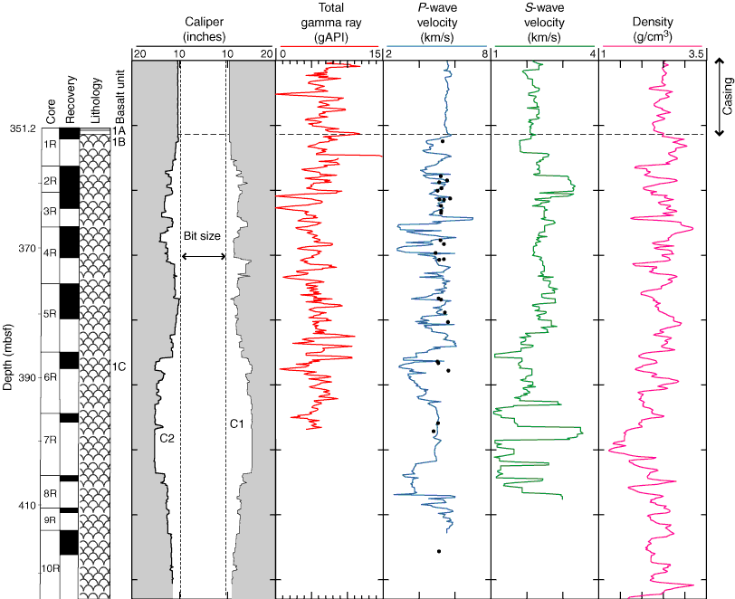 Figure F75. Results from the FMS-sonic tool string measurements in Hole U1301B. The left panels show the core reference with core recovery and principal lithologic units as defined from core descriptions. Data are from the first FMS-sonic tool string pass. Black dots in the P-wave velocity panel represent discrete measurements on core samples. The right panel shows the density log from the triple combo for comparison.