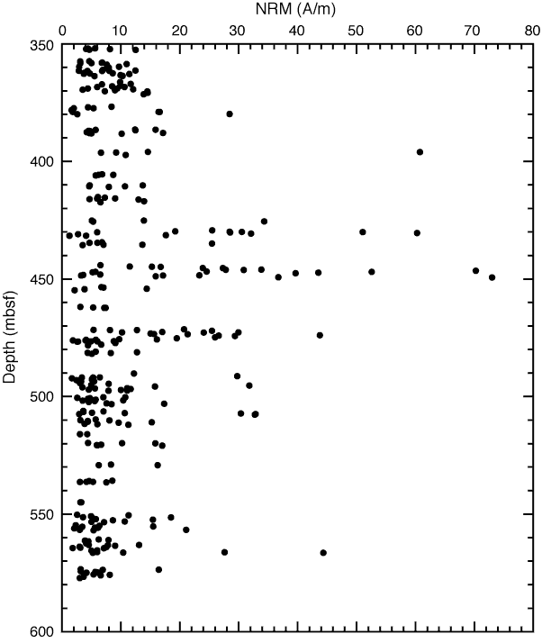 Figure F1. Natural remanent magnetization (NRM) of basalt samples, Hole U1301B.