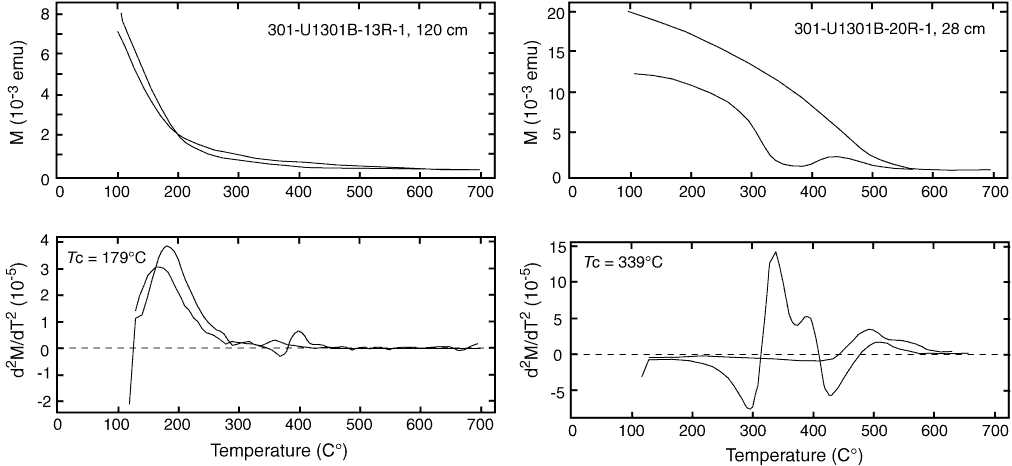 Figure F5. Magnetization behavior upon heating and cooling of two representative basalt samples, Hole U1301B. Sample 301-U1301B-13R-1, 130 cm, shows a reversible curve and gives a Curie temperature (Tc) of 179°C. Sample 301-U1301B-20R-1, 28 cm, is not reversible upon cooling and gives a Curie temperature of 339°C.