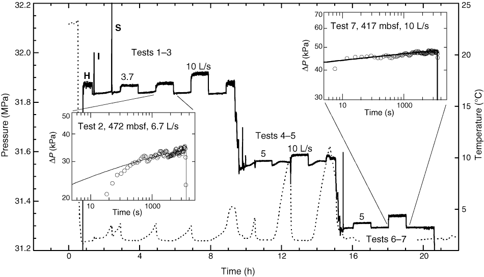 Figure F4. Downhole gauge pressure (solid line) and temperature (dashed line) record during packer experiments, Hole U1301B (modified from Becker and Fisher, 2008). At the first setting depth of 472 mbsf, cold hydrostatic pressure in the hole was monitored for 30 min (H) before actual packer inflation (I). At each inflation depth, packer inflation produces an uncontrolled pulse in the pressure record as a sliding sleeve is shifted to lock the packers inflated and open a passageway from the pressurized drill string to the formation isolated below the packer element (S). Inset plots show example fits of analytical radial flow model to filtered packer pressure records, with time relative to the start of individual injection tests.