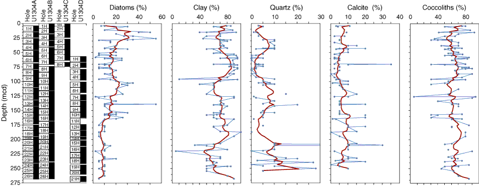 Figure F13. Abundance of diatoms, clay, quartz, calcite, and coccoliths from smear slide data from nannofossil ooze layers only.