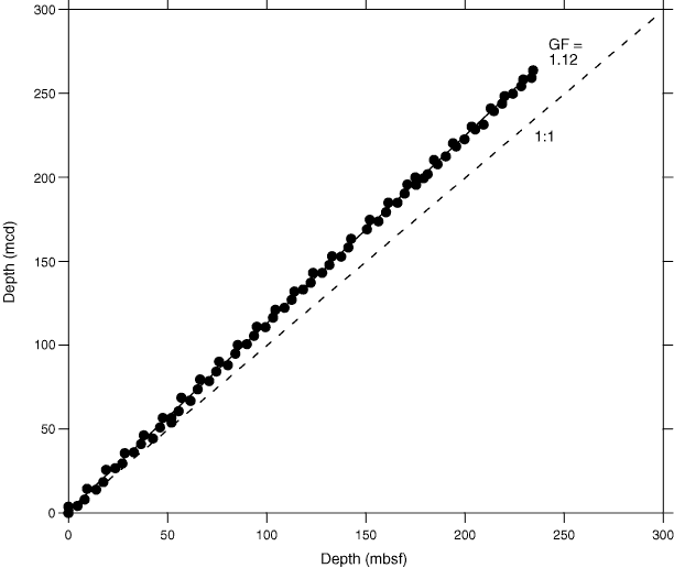 Figure F22. Meters composite depth versus meters below seafloor depth for tops of cores at Site U1304. The growth factor (GF) is the slope of the regression line for Sites U1302 and U1303 and for both sites combined. On average, the mcd of the spliced section is 12% greater than meters below seafloor.