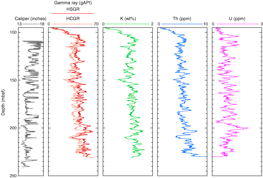 Figure F37. Caliper, total gamma ray and spectral gamma ray data (K, Th, and U) for the 95–250 mbsf interval, Hole U1305C. HCGR = computed gamma ray, HSGR = total spectral gamma ray, gAPI = American Petroleum Institute gamma ray units.