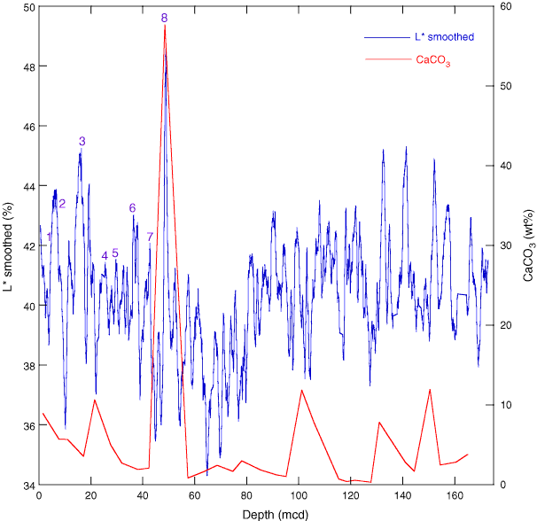 Figure F11. Variation of the sediment lightness (L* smoothed) and CaCO3. Peak numbers from 1 to 8 represent the location of the foraminifer ooze layers of Unit I.