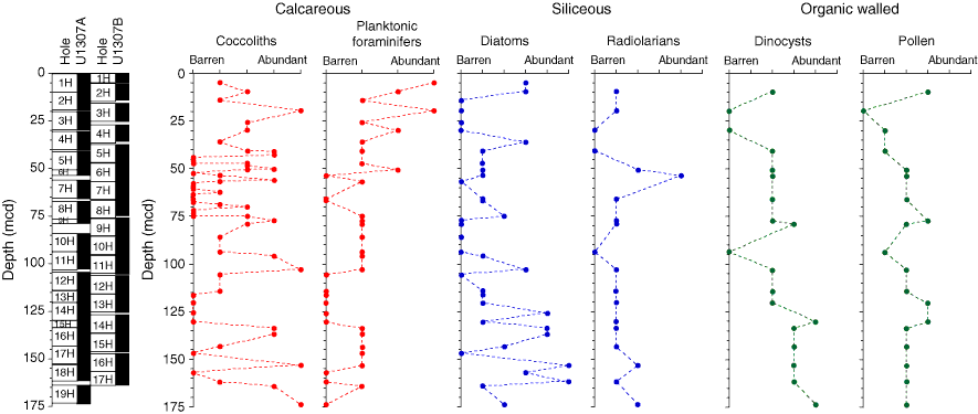 Figure F13. Site U1307 downcore relative abundance of calcareous nannofossils, planktonic foraminifers, diatoms, radiolarians, dinocysts, and pollen.