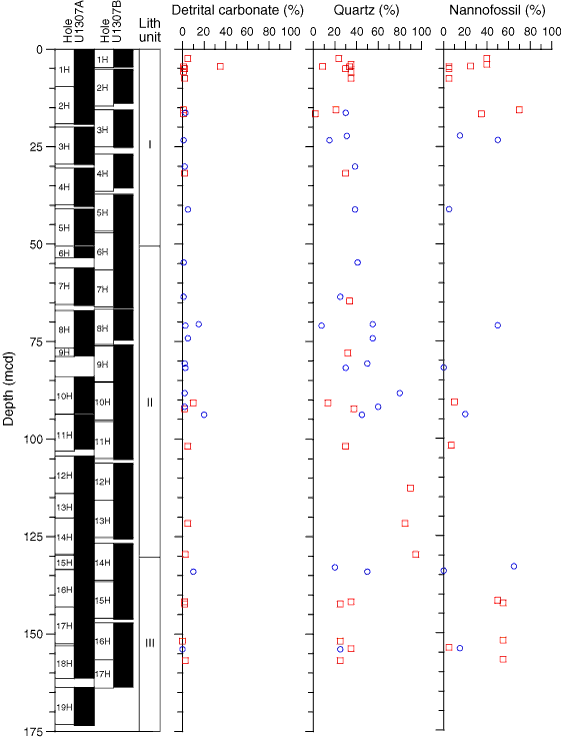 Figure F3. Abundances of quartz, detrital carbonate, and nannofossils. Circles = Hole U1307A data, squares = Hole U1307B data.