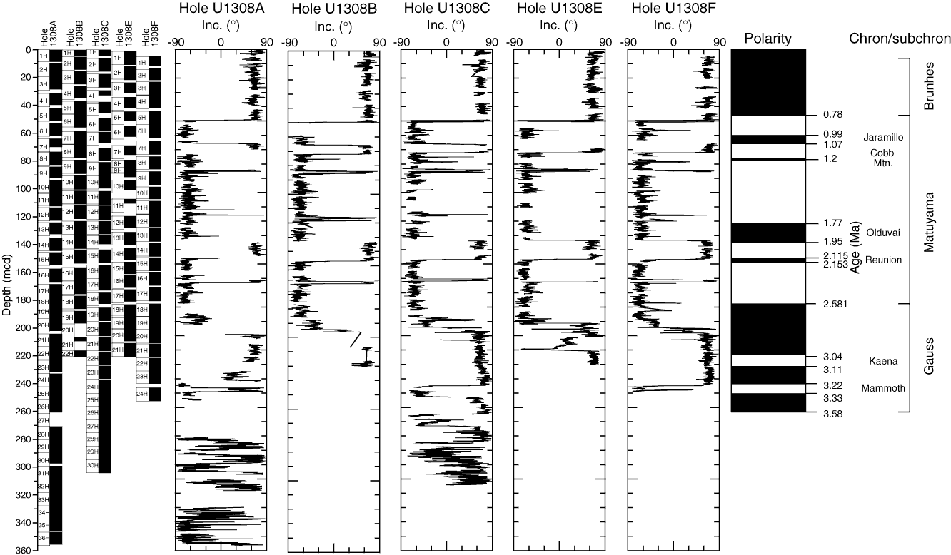 Figure F15. Site U1308 inclination of remanent magnetization after AF demagnetization at peak fields of 10 mT versus depth. Polarity timescale is shown for reference. Core recovery is shown in the left panel.