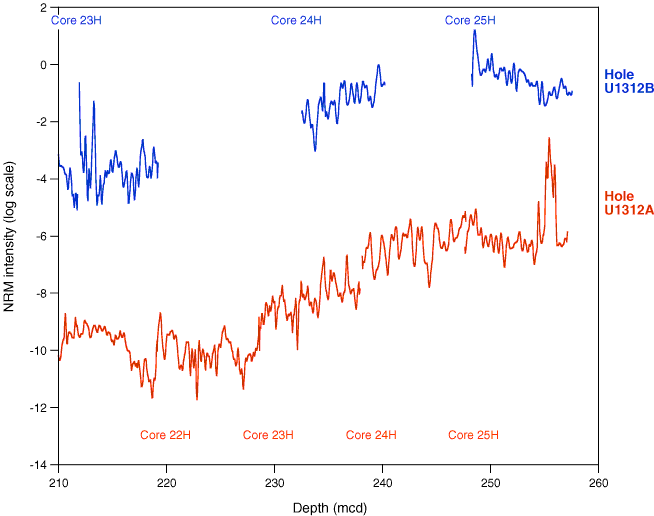 Figure F22. Possible correlation of Cores 306-U1312B-24H and 25H to the long-wavelength increase in natural remanent magnetic (NRM) intensity displayed in Hole U1312A.