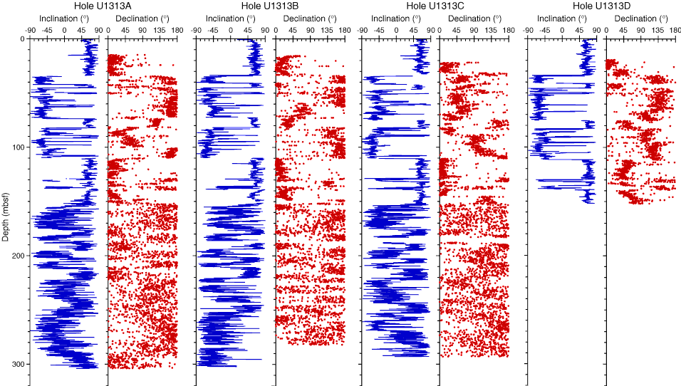 Figure F19. Inclination and declination of remanent magnetization after 20 mT AF demagnetization vs. depth. Declination values have been corrected using Tensor tool data.