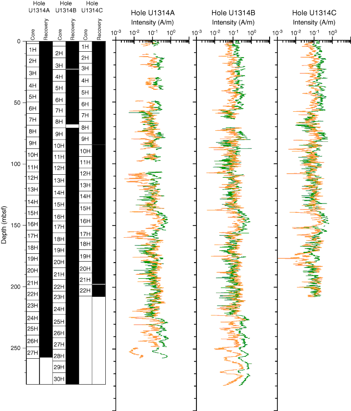 Figure F18. NRM intensity before (green) and after (red) AF demagnetization at 20 mT.