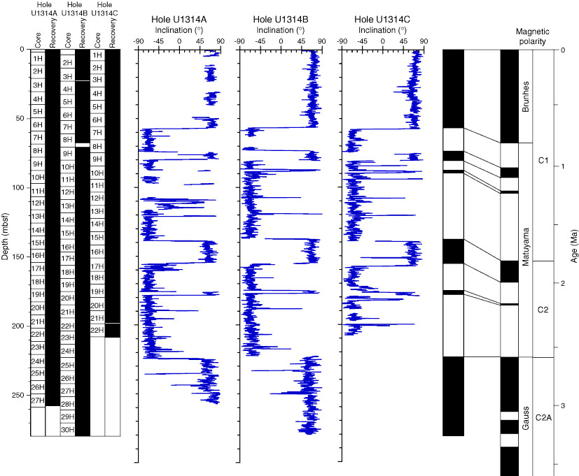 Figure F20. Inclination after 20 mT AF demagnetization. The paleomagnetic polarity interpretation (black = normal polarity, white = reversed polarity) is displayed on the right side of the figure along with the reference geomagnetic polarity timescale (Cande and Kent, 1995).