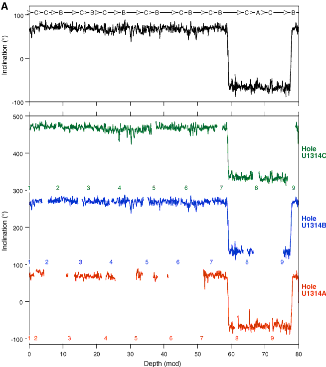 Figure F23. Inclination vs. mcd for each hole. Upper panels show composite inclination record indicating which hole was used to form the primary sampling splice. Numbers in lower panel indicate core numbers. A. 0–80 mcd. (Continued on next three pages.)