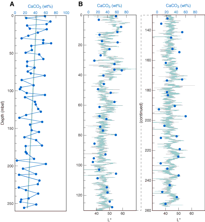 Figure F26. Calcium carbonate content for Hole U1314A. A. Gray line indicates the general trend from lower mean CaCO3 abundance at the bottom toward a higher average at the top. B. CaCO3 (blue dots) compared to color reflectance (L*; gray line).