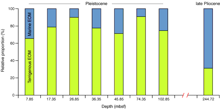 Figure F30. Proportions of marine (blue) and terrigenous (green) extractable organic matter (EOM) at Site U1314 as estimated from the ratios of C27, C29, and C31 n-alkanes to C37 alkenones. Note that the distance between bars does not represent the actual sample position in the depth profile.