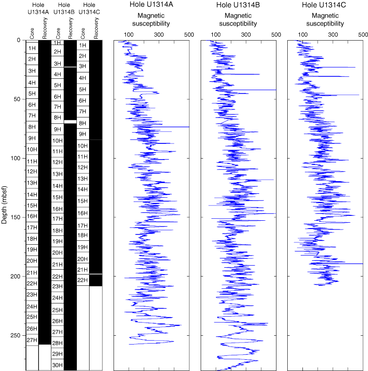 Figure F31. Magnetic susceptibility records from the MST. Multiply values by 6 × 10–5 to obtain SI units.