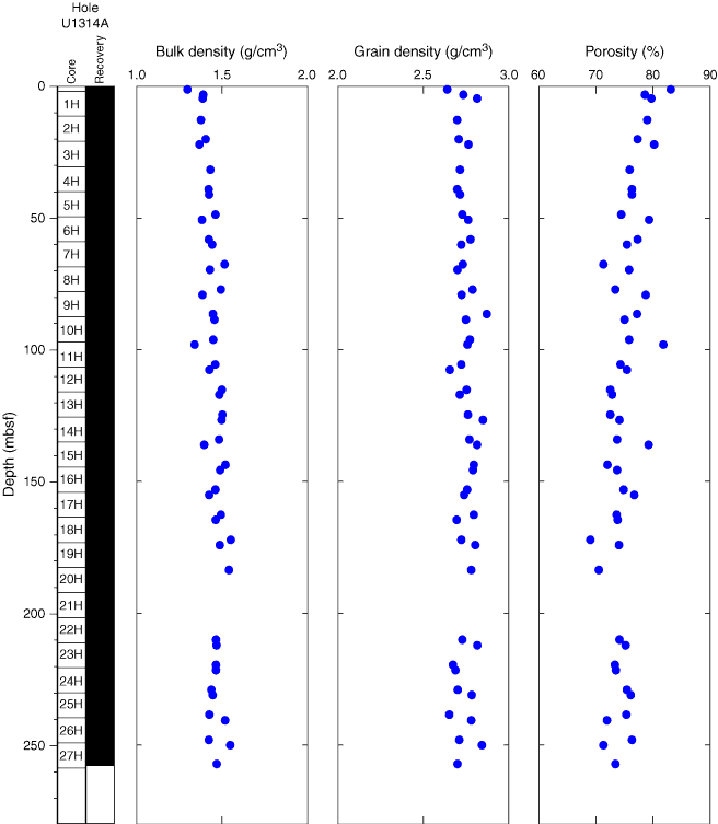 Figure F33. Bulk and grain density and porosity values from Hole U1314A.