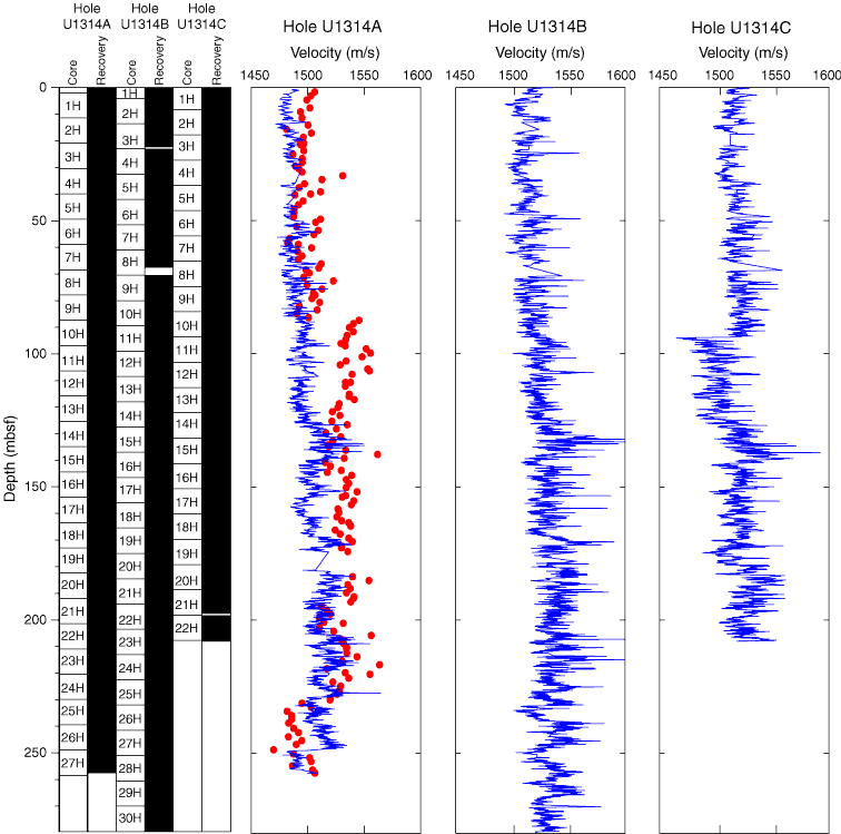 Figure F34. Downcore PWL velocity records. Discrete PWS3 measurements from Hole U1314A are shown in red.