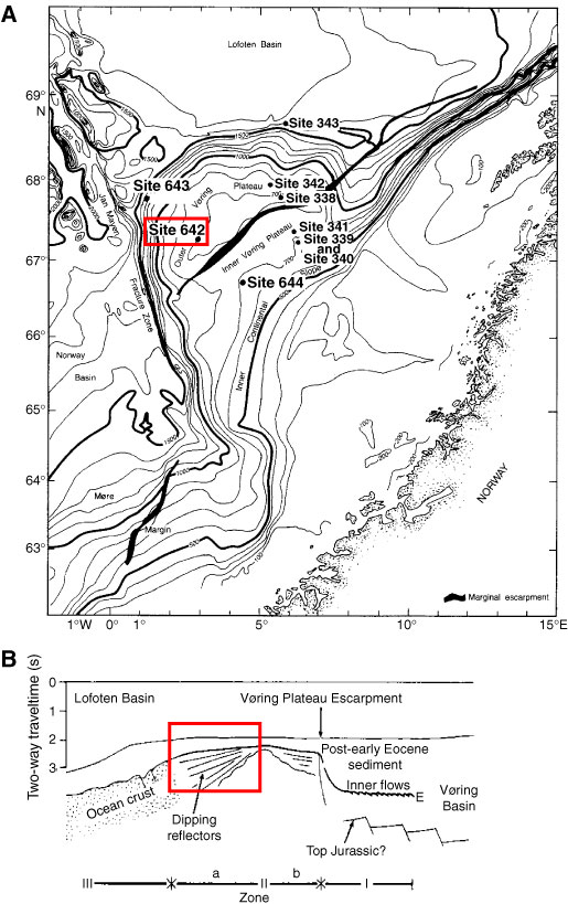 Figure F1. A. Map of the Vøring Plateau with locations of Deep Sea Drilling Project Leg 38 and ODP Leg 104 sites. B. Schematic geological transect across the Vøring Plateau (from Eldholm, Thiede, Taylor, et al., 1987).