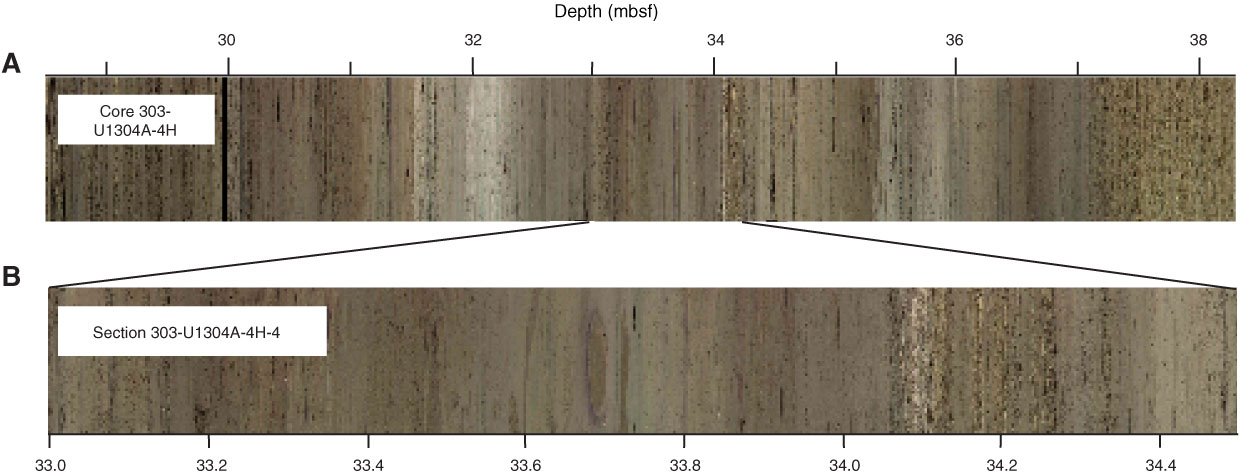 Figure F2. A. Compound image of Core 303-U1304A-4H. B. Image of Section 303-U1304A-4H-4 used in construction of total core image. Images have been brightened to accentuate layering of sediments. Black interval just above 30 mbsf is due to a water content sample being taken from the core.