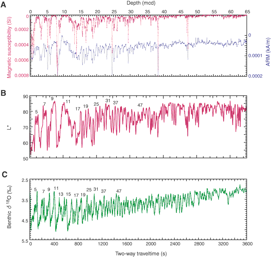 Figure F3. Correlation between (A) magnetic concentration, (B) lightness (L*), and (C) global benthic oxygen isotope stack (Lisiecki and Raymo, 2005). ARM = anhysteretic remanent magnetization.