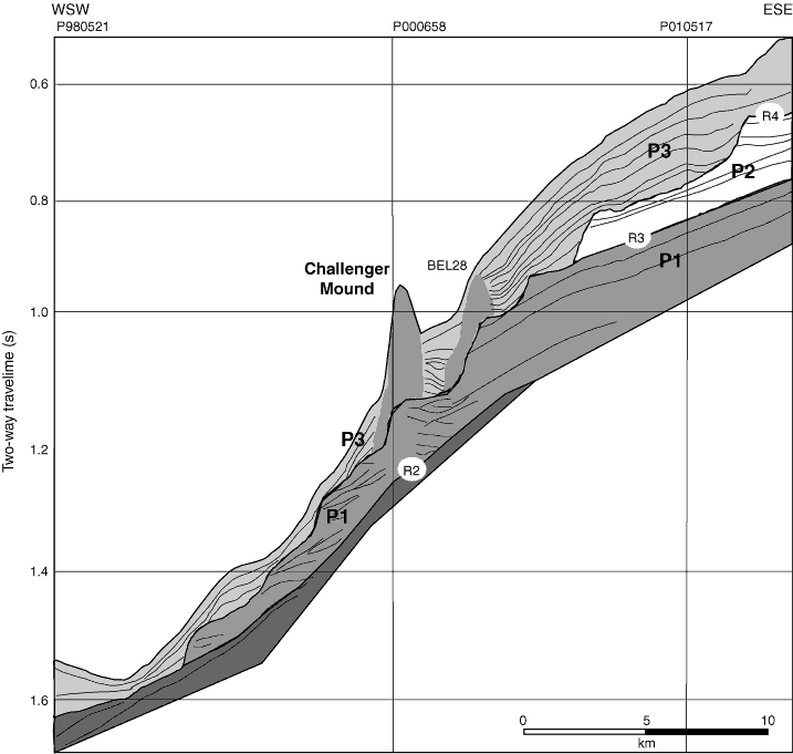 Figure F3. Interpretation of high-resolution seismic profile P980521 underlying Challenger Mound and slope (after De Mol et al., 2002).