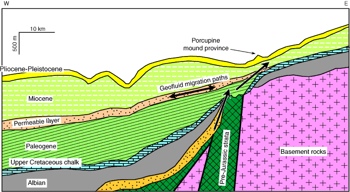 Figure F4. Geological interpretation of Porcupine Basin stratigraphy in the Belgica province (after Naeth et al., 2005). Arrows = modeled pathways of hydrocarbon-rich gases.