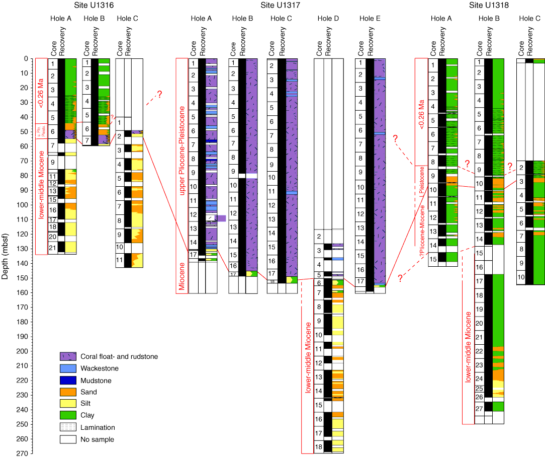 Figure F8. Lithostratigraphic correlation. Geologic ages were estimated from biostratigraphic data.